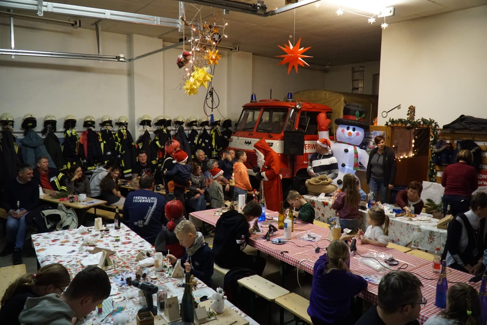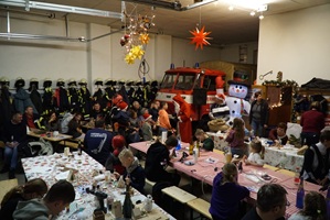Etwas später am Tag fand auch der Weihnachtsmann wieder den Weg zu uns, natürlich mit reich gefüllten Geschenkesack. Es wurden gemeinsame Weihnachtslieder angestimmt und von den Kindern originelle Gedichte vorgetragen. So zog eine besinnliche Weihnachtstimmung ein und aufgeheiterte Gesprächsrunden hallten durchs Gerätehaus. Ein gelungener Nachmittag neigte sich dem Ende entgegen und wir freuen uns bereits auf das 15. Weihnachtsbasteln, diesmal im neuen Gerätehaus.