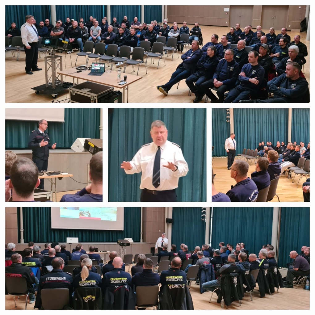 Das Thema Führung und Führungsorganisation, als elementare Grundlage eines erfolgreichen Feuerwehreinsatzes, wurde dabei veranstaltungsfüllend auf die Tagesordnung gesetzt. Der Marienberger Stadtwehrleiter Kam. Kay Kretzschmar konnte hierfür Kam. Mathias Bessel als Referenten gewinnen. Der Fachbereichsleiter Einsatz – Katastrophenschutz – Umweltschutz im Landesfeuerwehrverband Sachsen e.V. machte den 57 anwesenden Kameraden in seiner unnachahmlichen Art die Bedeutung einer durchdachten und gut strukturierten Führung vor Ort deutlich. Die grundsätzlichen Begrifflichkeiten aus der FwDV 100 wurden dabei ebenso beleuchtet, wie die individuellen Verantwortlichkeiten der Gruppen-, Zug- und Verbandsführer in den jeweiligen Führungsstufen. Zudem nahm die Optimierung der Betriebsabläufe beim Errichten ortsfester oder mobiler Befehlsstellen besonderen Raum ein.