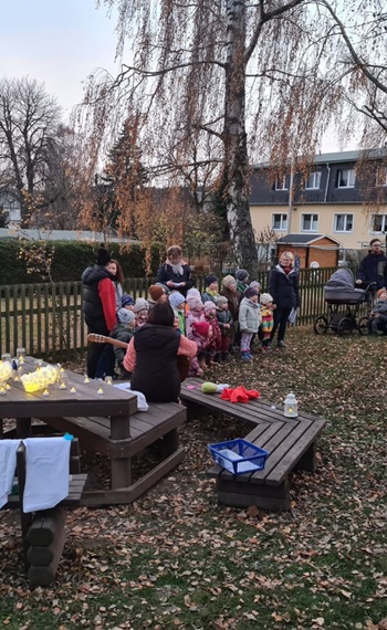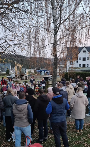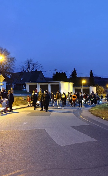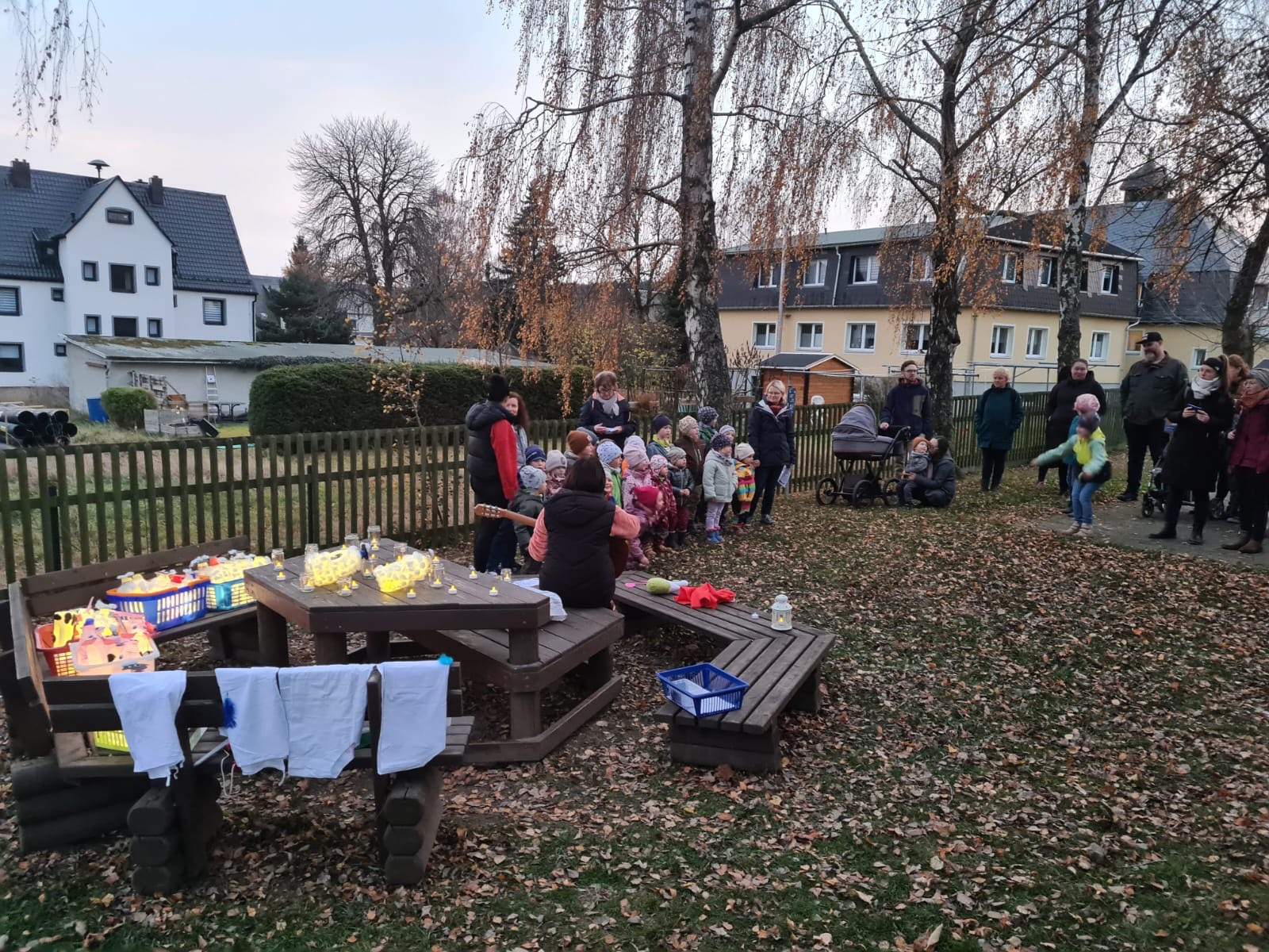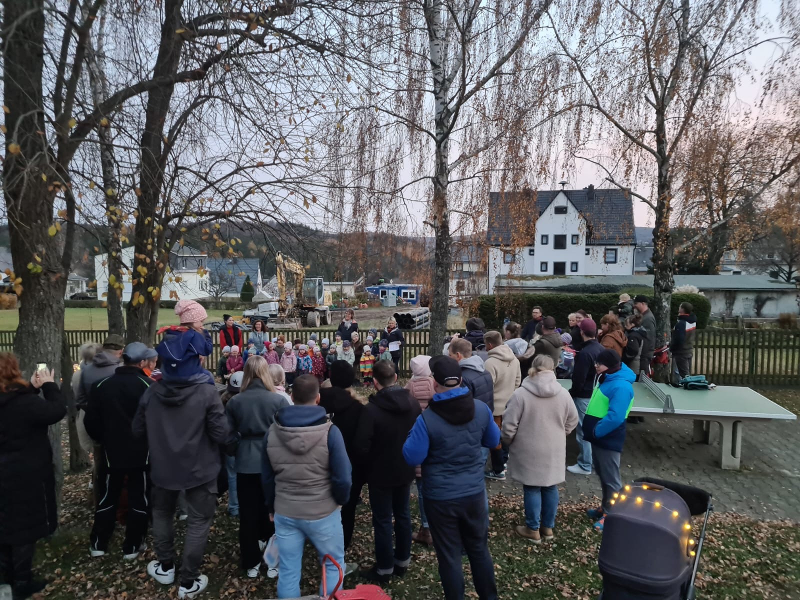 Es wurde schon leicht dunkel und die ersten Lampions leuchteten. Das von den Kindern mit vollem Eifer vorgetragene Programm stimmte auf den Abend ein und liebevoll gebackene Kekse fanden ganz schnell begeisterte Abnehmer. Der anschließende Laternenumzug war besonders anheimelnd und die vielen kleinen, teils selbst gebastelten Lampions und Laternen erleuchteten romantisch das Dorf. Es gab sogar etliche Bewohner, die unsere Kleinen bereits am Straßenrand erwarteten.