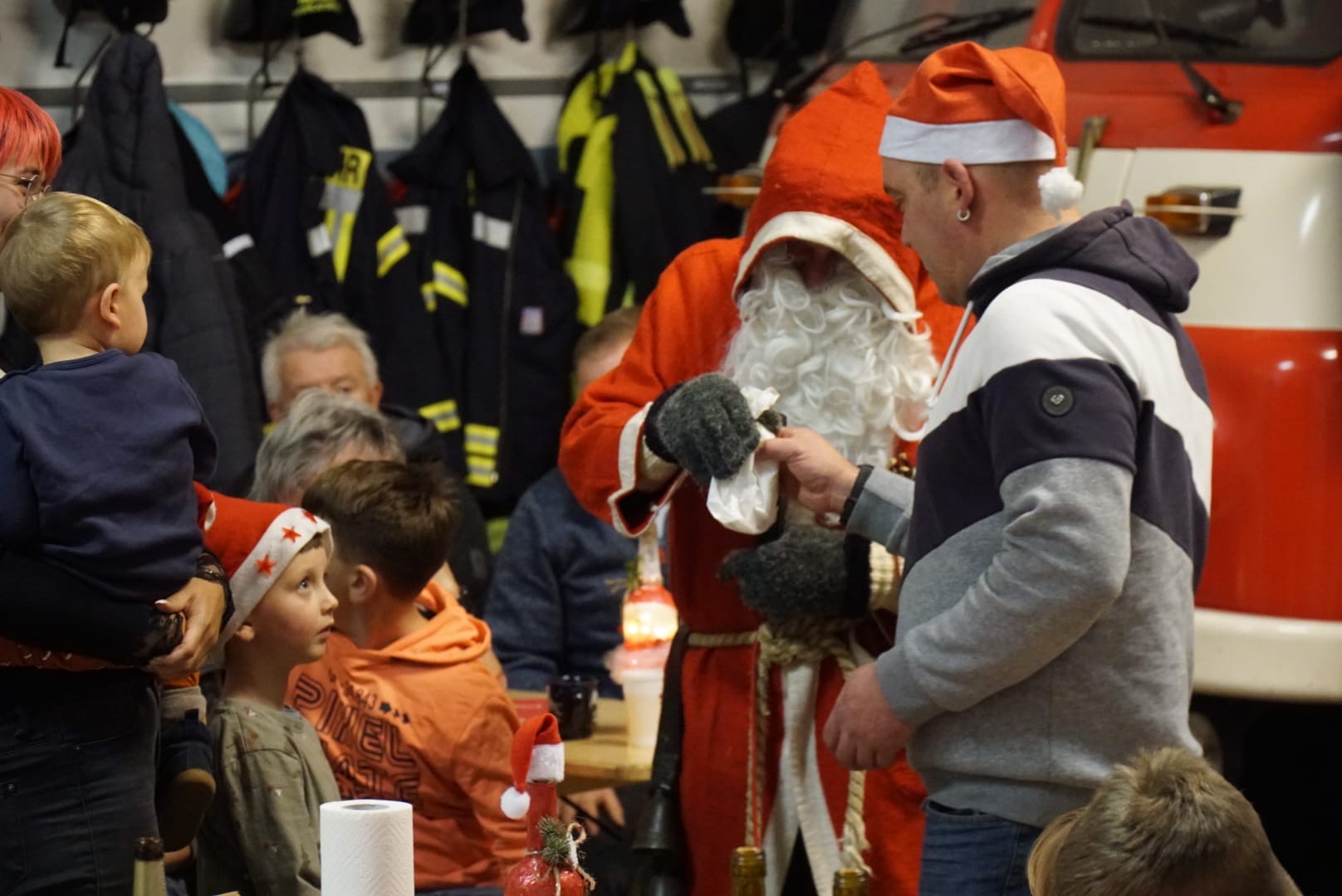 Etwas später am Tag fand auch der Weihnachtsmann wieder den Weg zu uns, natürlich mit reich gefüllten Geschenkesack. Es wurden gemeinsame Weihnachtslieder angestimmt und von den Kindern originelle Gedichte vorgetragen. So zog eine besinnliche Weihnachtstimmung ein und aufgeheiterte Gesprächsrunden hallten durchs Gerätehaus. Ein gelungener Nachmittag neigte sich dem Ende entgegen und wir freuen uns bereits auf das 15. Weihnachtsbasteln, diesmal im neuen Gerätehaus.