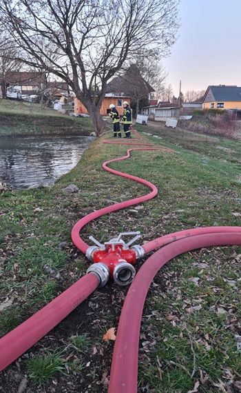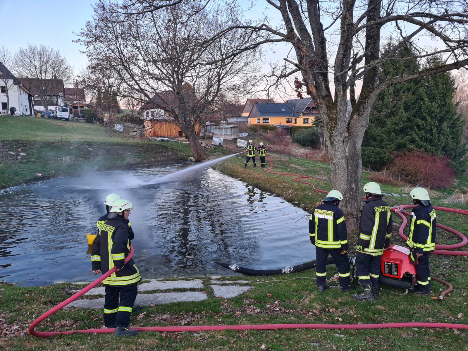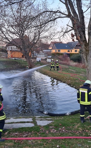 Nach den Entschlammungs- und Hochwasser-Baumaßnahmen im letzten Jahr, die infolge der Starkniederschläge 2021 durchgeführt wurden, konnte erstmalig seit vielen Jahren auch der Leberechtteich wieder für Feuerwehrzwecke genutzt werden.
